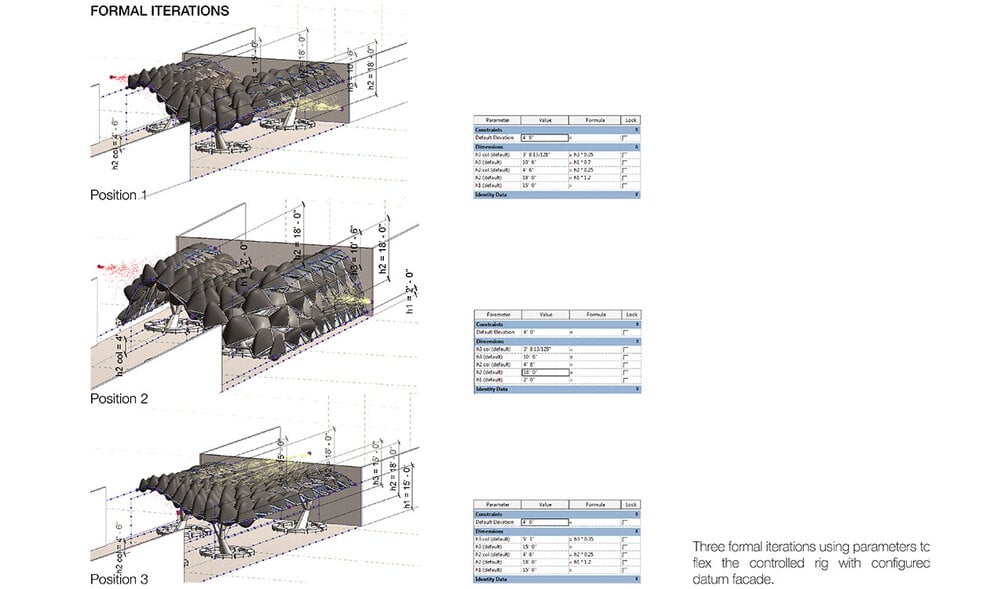 The inflated canopy height is derived from the distance from the two influenced point, which is applied to the mass curtain pattern family. This similar concept can be utilized to create similar families. This package will includes the Revit project file with individual families to create the whole canopy.