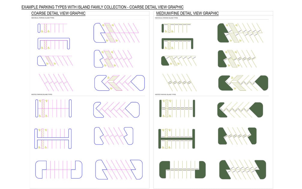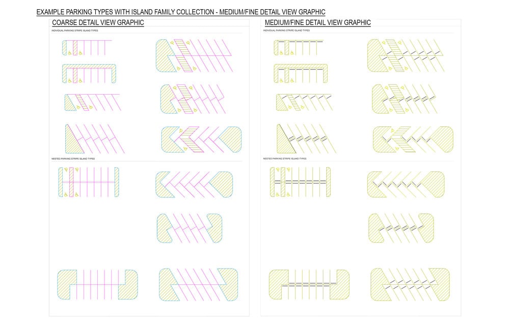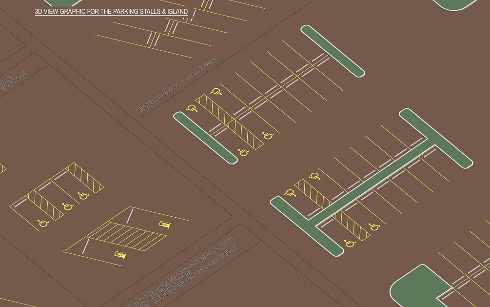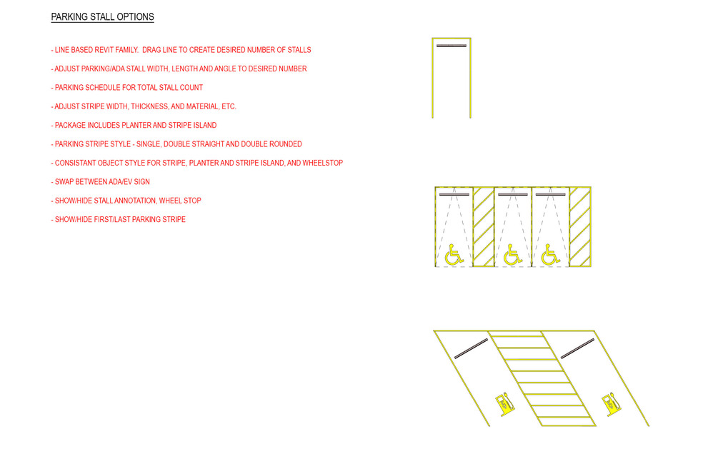 -Single Revit Family creates all different Parking Stall styles. Create new versions or swap between different nested family styles and parameters.