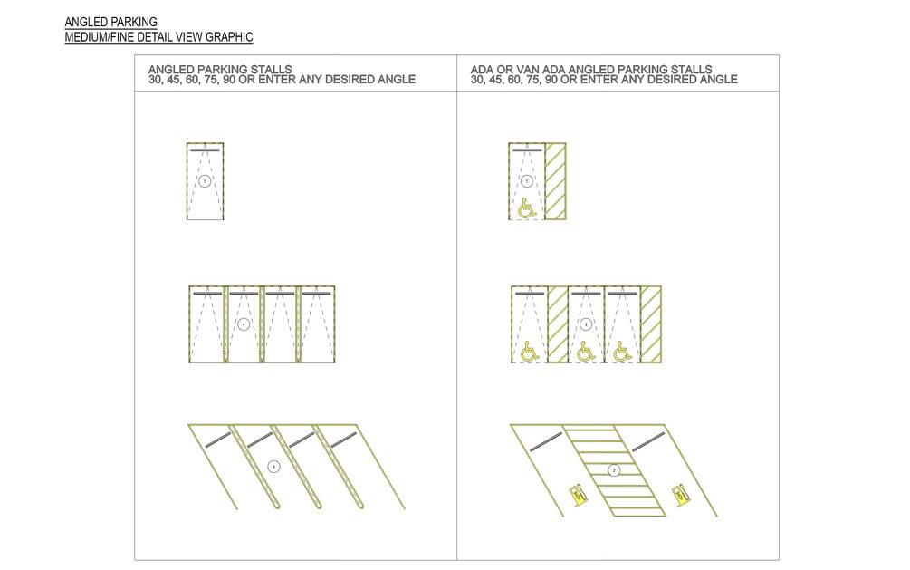 This parametric Parking Stall Revit Family can create all the different versions of 2D & 3D versions that you will need for your next project, helping avoid common coordination errors. It can draw all normal and ADA stall type with standard angle 30, 45, 60, 75, and 90, etc, and desired custom angle field to make it work.